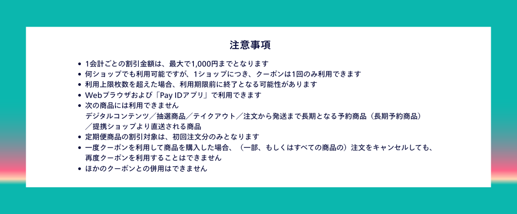 ・何ショップでも利用可能ですが、1ショップにつき同じクーポンは1回のみご利用いただけます。