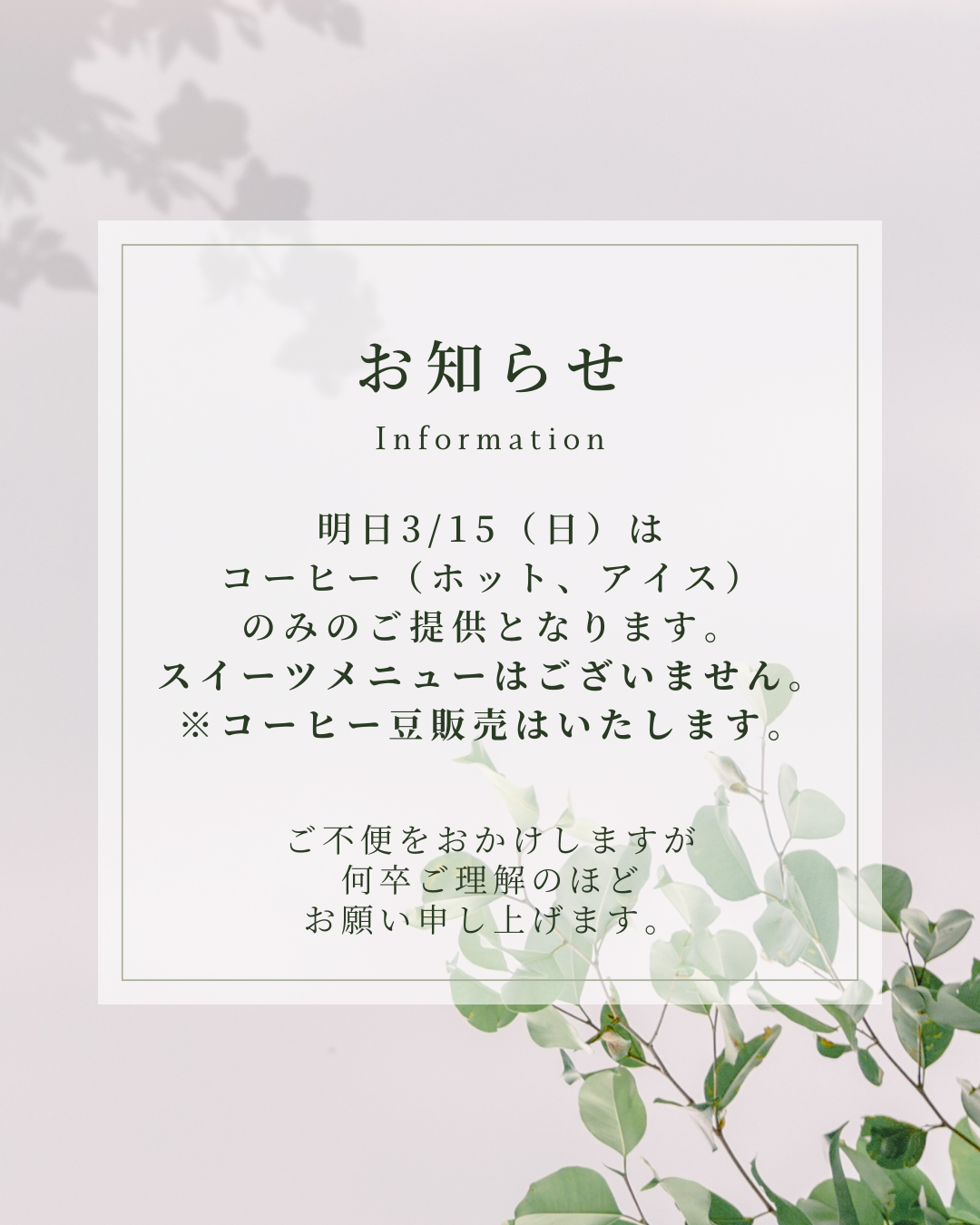 また、イートインメニューはコーヒー(ホット、アイス)のみのご提供とさせていただきます。